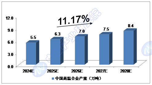 我們預(yù)計,2024年我國高溫合金產(chǎn)量將達(dá)到5.5萬噸,未來五年(2024-2028)年均復(fù)合增長率約為11.17%,2028年將達(dá)到8.4萬噸。