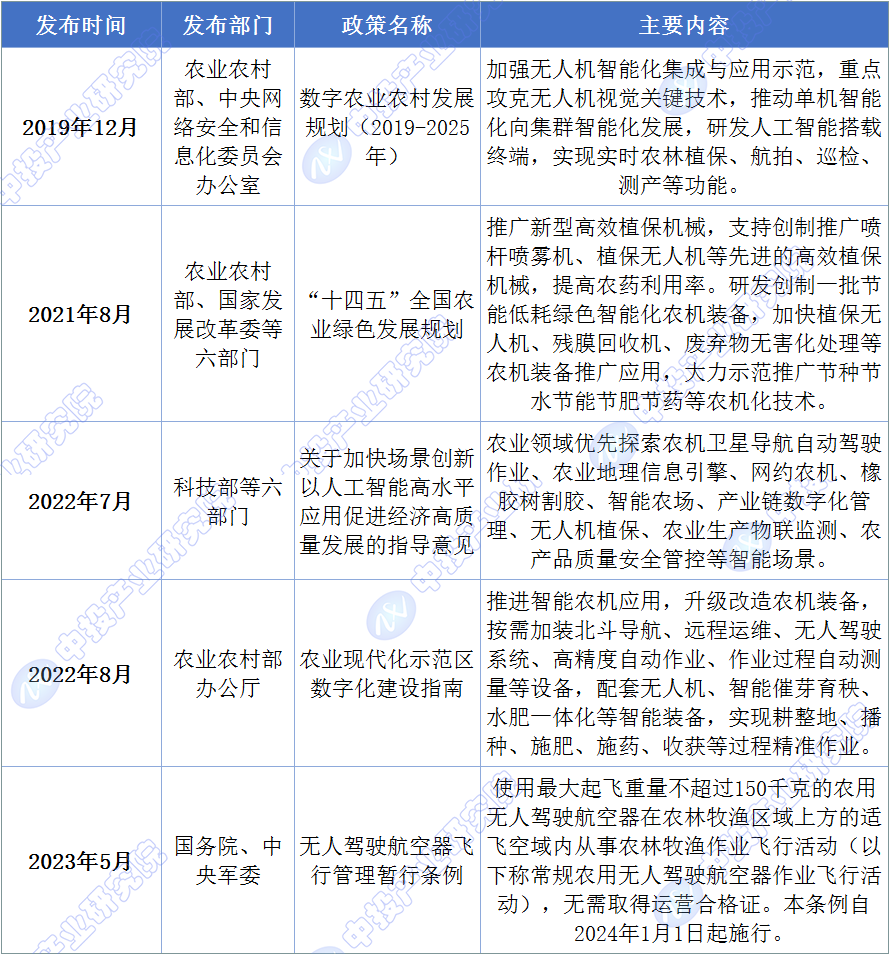 中投產(chǎn)業(yè)研究院發(fā)布的《2024-2028年中國低空經(jīng)濟(jì)深度調(diào)研及投資前景預(yù)測報(bào)告》指出,近年來國家相繼出臺多項(xiàng)利好政策,推動植保無人機(jī)行業(yè)發(fā)展。如2021年8月農(nóng)業(yè)農(nóng)村部、國家發(fā)展改革委等六部門發(fā)布的《“十四五”全國農(nóng)業(yè)綠色發(fā)展規(guī)劃》提出推廣新型高效植保機(jī)械,支持創(chuàng)制推廣噴桿噴霧機(jī)、植保無人機(jī)等先進(jìn)的高效植保機(jī)械,提高農(nóng)藥利用率。研發(fā)創(chuàng)制一批節(jié)能低耗綠色智能化農(nóng)機(jī)裝備,加快植保無人機(jī)、殘膜回收機(jī)、廢棄物無害化處理等農(nóng)機(jī)裝備推廣應(yīng)用,大力示范推廣節(jié)種節(jié)水節(jié)能節(jié)肥節(jié)藥等農(nóng)機(jī)化技術(shù)。政策條款匯總情況如下: