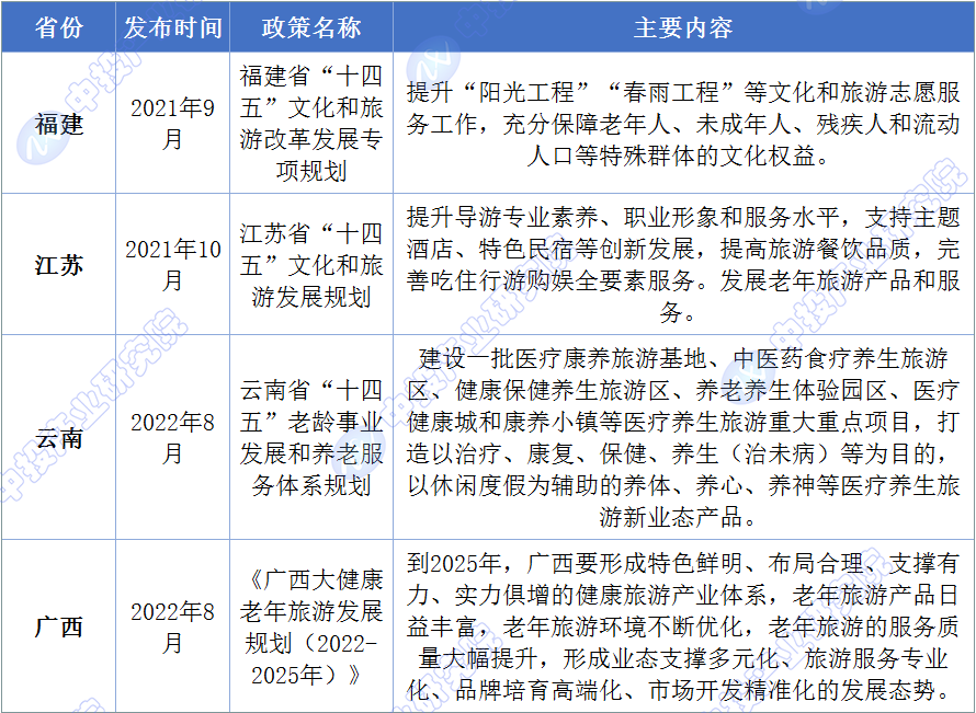 為了響應(yīng)國(guó)家號(hào)召,各省市紛紛出臺(tái)養(yǎng)老旅游行業(yè)支持政策,如2022年8月,廣西自治區(qū)文化和旅游廳印發(fā)《廣西大健康老年旅游發(fā)展規(guī)劃(2022-2025年)》,提出到2025年,廣西構(gòu)建大健康老年旅游“四區(qū)一帶”發(fā)展格局。